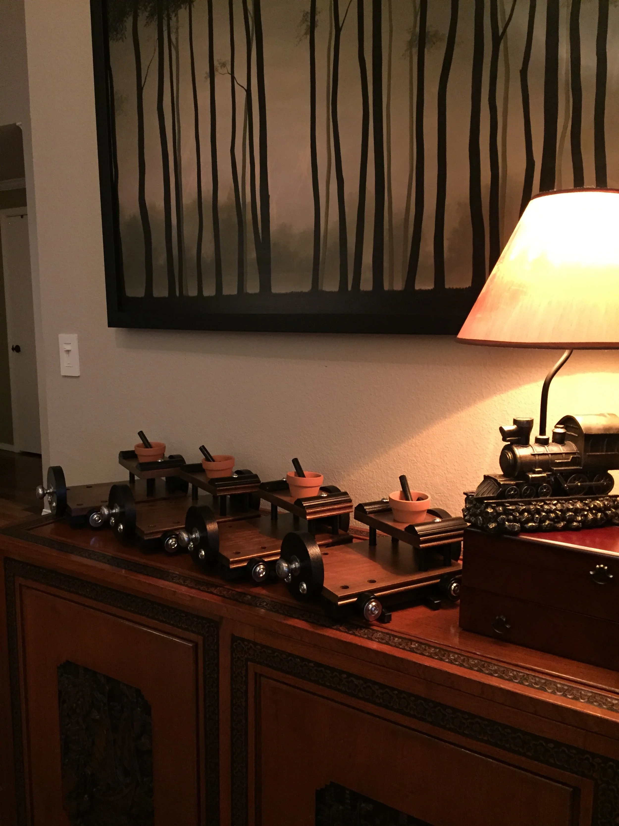 It was the first piece of furniture her mom bought after striking out on her own in the early 1940’s. With much ingenuity, that old bookcase was taken apart and every inch of wood was repurposed into building 7 trains and 4 smaller milk wagon carts as gifts for family members. The idea of making trains and milk wagons came from Cindy’s mom’s love of trains and her childhood dairy farm years in Wisconsin.