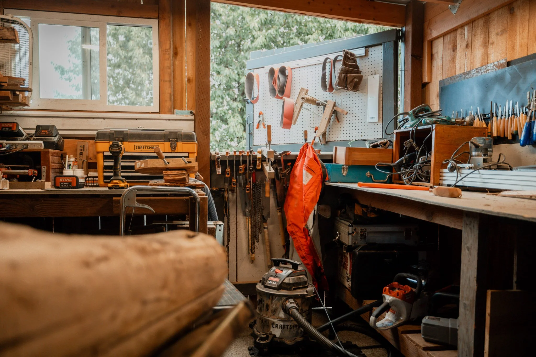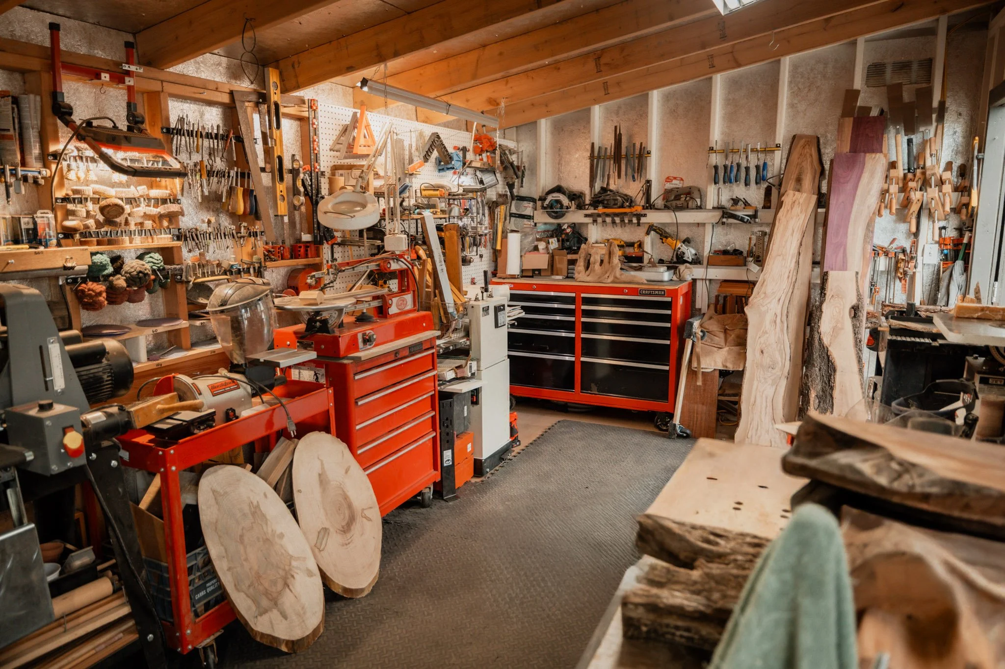 The cutting station is a room attached to the kiln station. This is the messy space, housing chain saws, sanders and lots of non-dimensional lumber One side has a Dutch door which allows for air flow, a beautiful view outside and easy access for bringing in large pieces of wood.