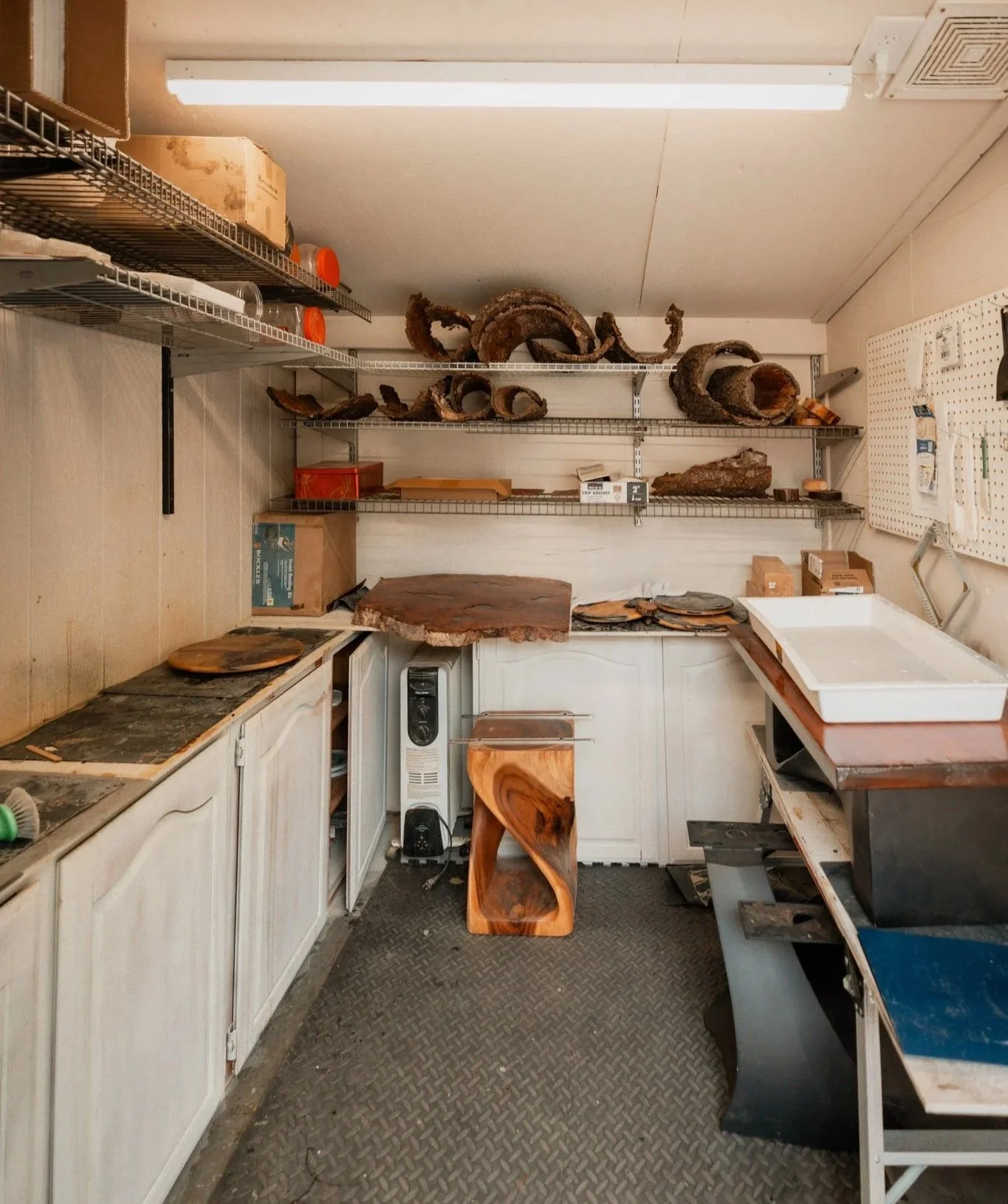 The finishing station is a smaller building adjacent the main shop where epoxy is poured and various finishes are applied, most of which are food safe. Wood enters this warm building as dust free as possible and the inside environment is kept the same.