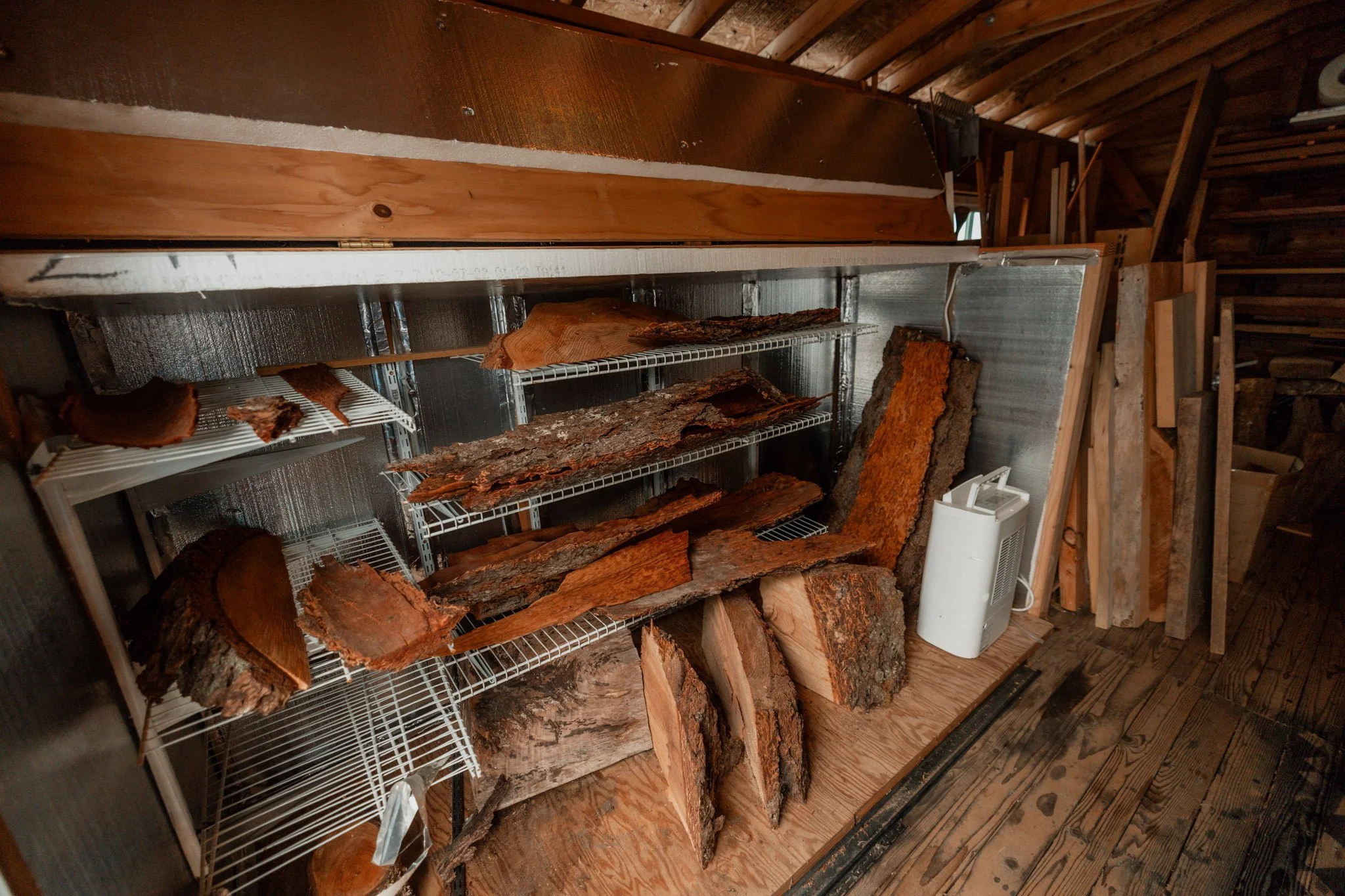 Here you have the kiln station. The kiln was built by Cindy and Patty to have adjustable racks, a removable front panel and a folding top. The climate inside is actually controlled from Cindy’s phone! This building houses dimensional lumber.