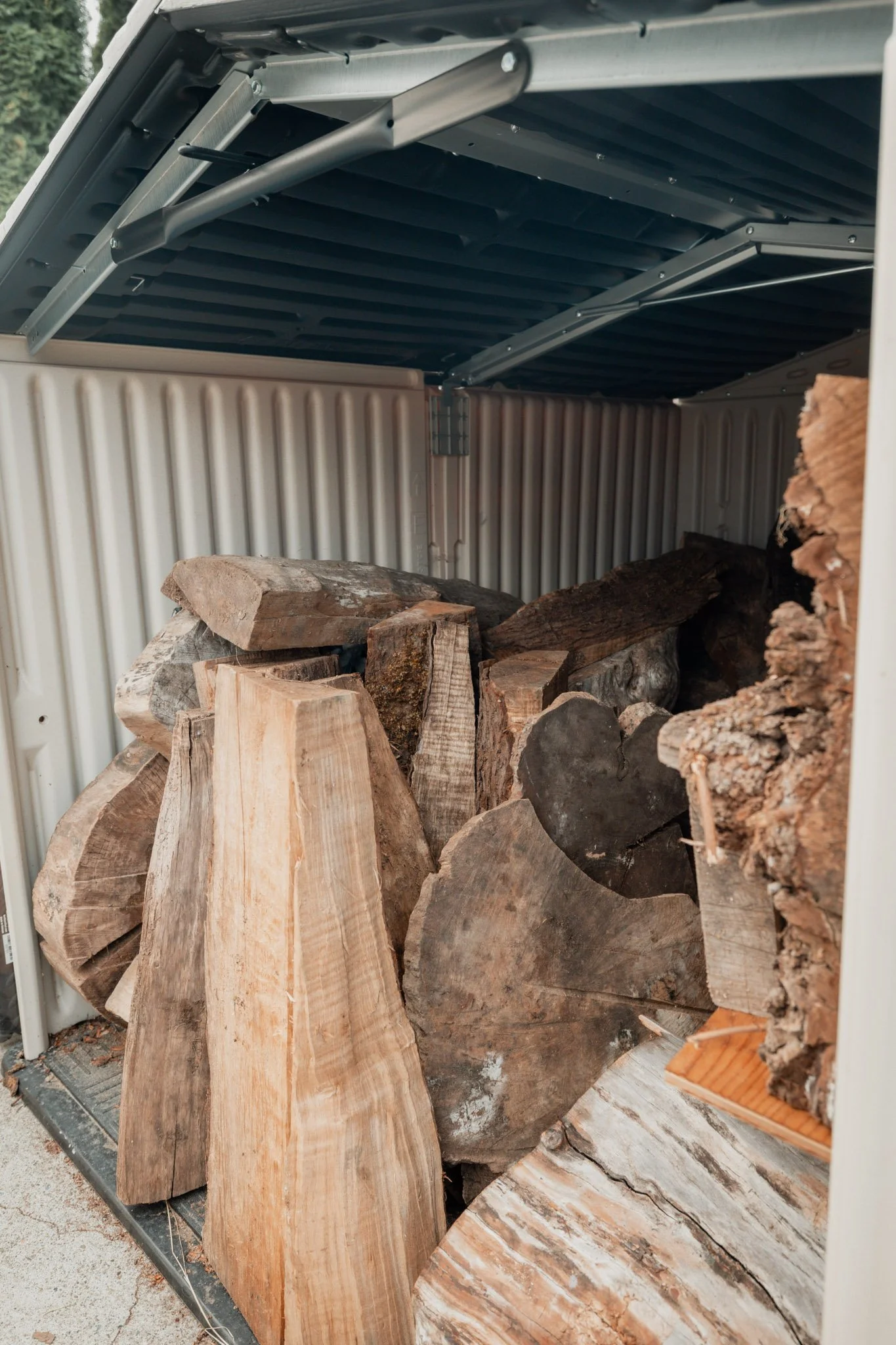 Wood is categorized and stored in various places on the property. Smaller pieces of logs, wood slabs and roots are stored for creative projects yet to whisper their evolutionary call.