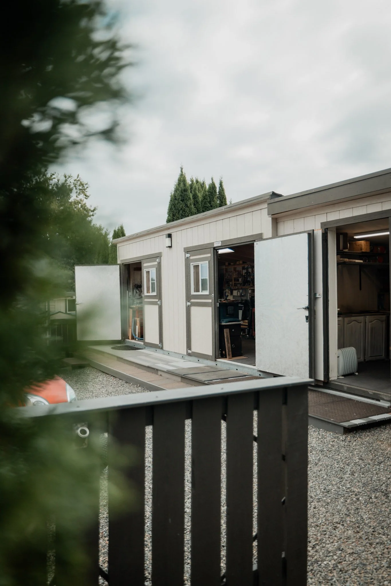 Here you see the main shop, a tuff shed model with doors rearranged to accommodate large machinery and pieces of wood. This building is where design through cutting, sanding and processing takes place. As you can see there are tools galore. It also houses a dust collection system, several large sanders, a drill press, scroll saw and a band saw. Inside the main shop is where the magic happens.